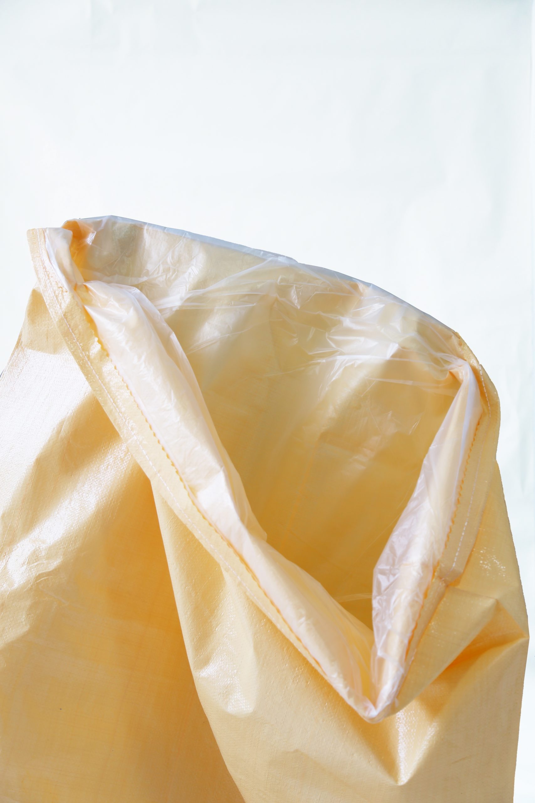 Saco de ráfia, reforçado com plástico no interior que se complementam entre si para assegurar um transporte ou armazenamento de produtos com características mais específicas. Maior proteção contra o ar, vapor de água e poeiras.
